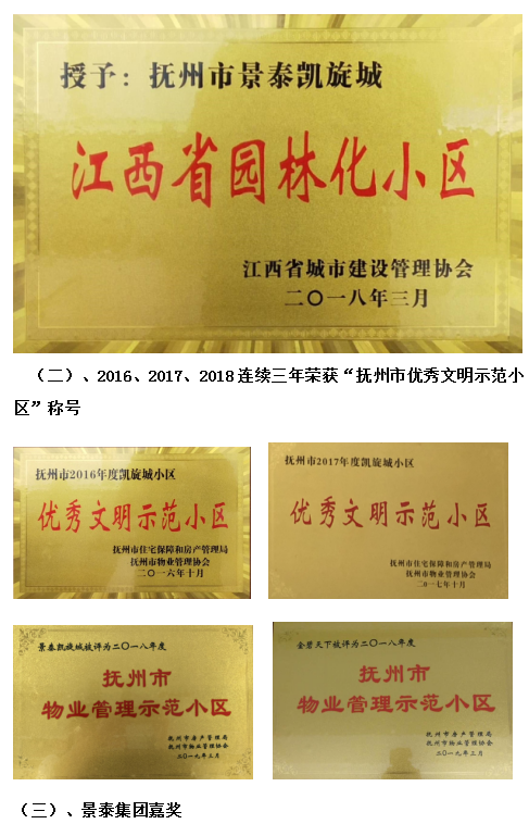 2016年、2017年、2018年连续三年景泰·凯旋城获得“抚州市优秀文明示范小区” “抚州市物业管理示范小区”称号;